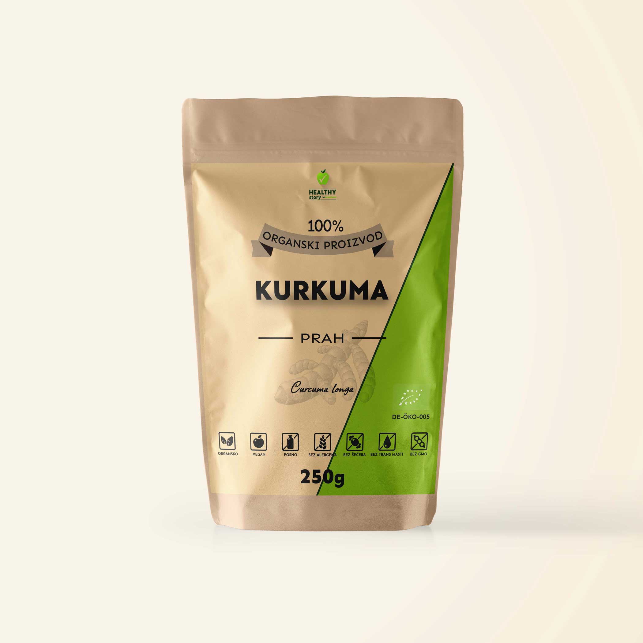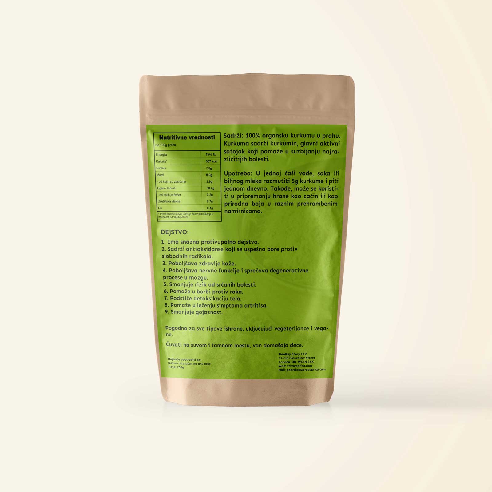 100% organska kurkuma prah. Sadrži jedinjenja sa lekovitim svojstvima, koja se nazivaju kurkuminoidi, od kojih je najvažniji kurkumin. Kurkumin je glavni aktivni sastojak kurkume, koji ima moćno antiinflamatorno dejstvo i vrlo je jak antioksidans.