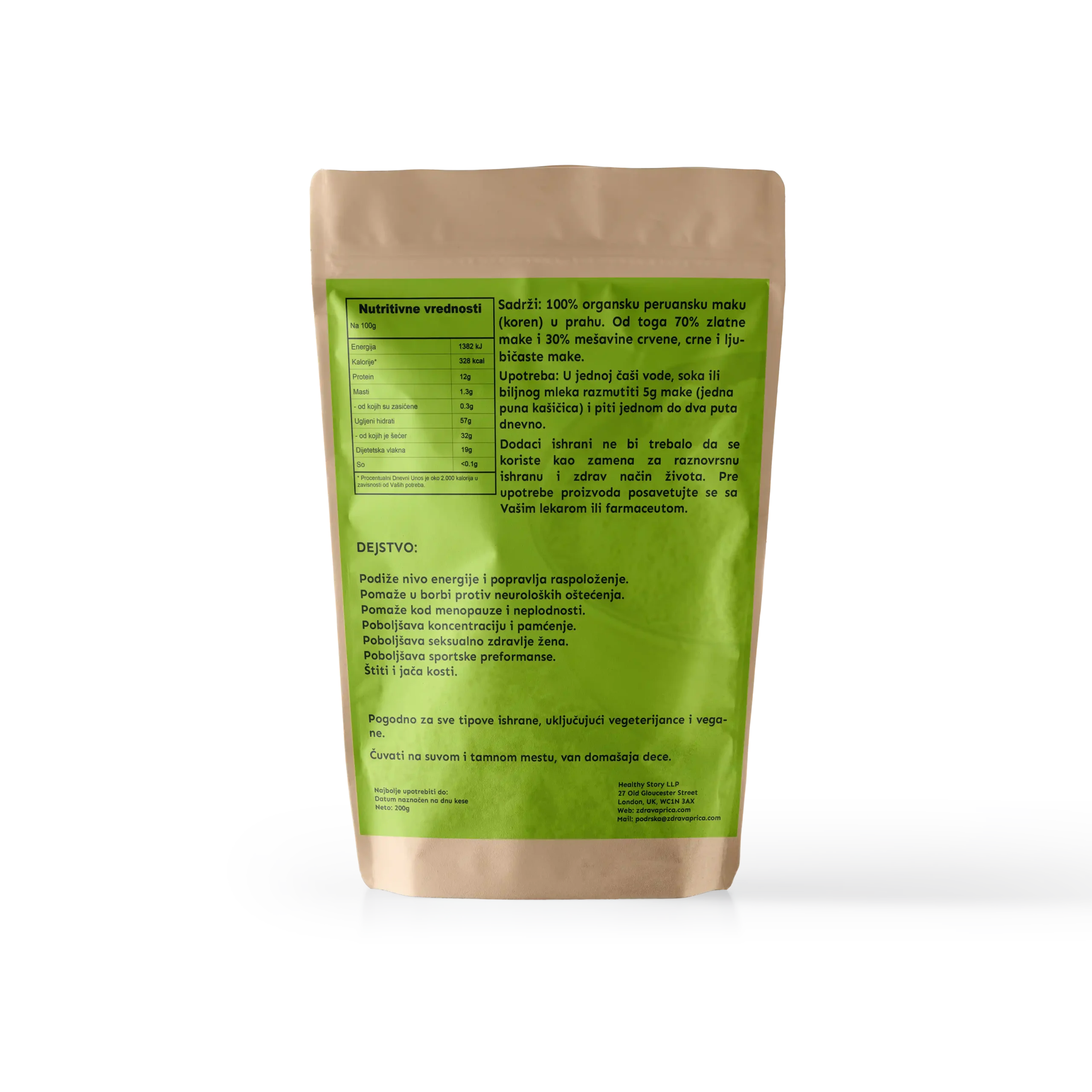 • 100% organski prah peruanske make. Od toga je 70% zlatne make i 30% mešavine crvene, crne i ljubičaste make.